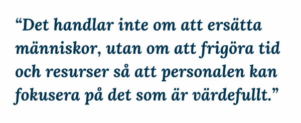 Tänk på att det inte handlar om att ersätta människor, utan om att frigöra tid och resurser så att personalen kan fokusera på det som är värdefullt. Börja gärna i liten skala, utvärdera och justera längs vägen. På så sätt minskar du risken och ökar chansen att hitta rätt.