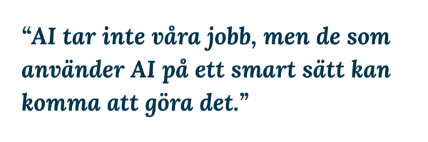Diskussionerna kring AI kan liknas vid farhågorna kring datorerna för 50 år sedan. Datorerna tar våra jobb, vi är hotade och blir överflödiga. På ett sätt hade de rätt – det finns inte så många ekonomiassistenter som summerar siffror och skriver listor längre – men det har inte blivit färre personer som arbetar med ekonomi och administration trots det. Uppgifterna skiftar, och idag jobbar alla med datorer på något sätt. Vi kan anta att AI kommer att gå samma väg, avdramatiseras och bli en naturlig del av arbetet. AI tar inte våra jobb, men de som använder AI på ett smart sätt kan komma att göra det.
