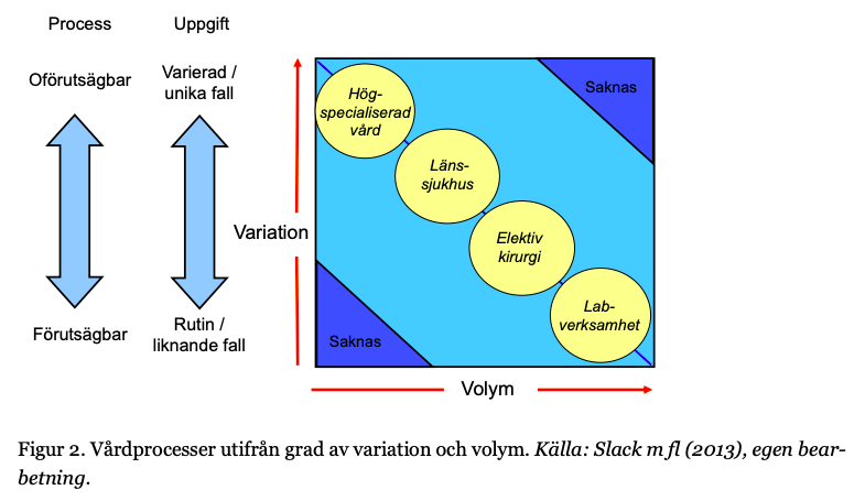 En sådan modell presenteras av Slack m fl (2013), som tittar specifikt på matchen mellan verksamhetslogik och möjligheterna att uppnå effektivitetsvinster genom standardisering. Här konstateras att organisering utifrån vårdprocesser knutna till specifika medicinska tillstånd som har standardiserats på en övergripande nivå kan vara funktionellt för vissa avgränsade delar av vården som består av aktiviteter med höga volymer, relativt låg variation och ett förutsägbart förlopp. Här finns det tillräckligt många och tillräckligt lika patienter för att fördelarna med en standardiserad flödesorganisering ska överväga dess nackdelar. I verksamheter som präglas av stor variation, där varje patienttillstånd är unikt, skulle flödet behöva justeras vid varje tillfälle och organisering utifrån fasta vårdprocesser blir därmed mindre ändamålsenligt.