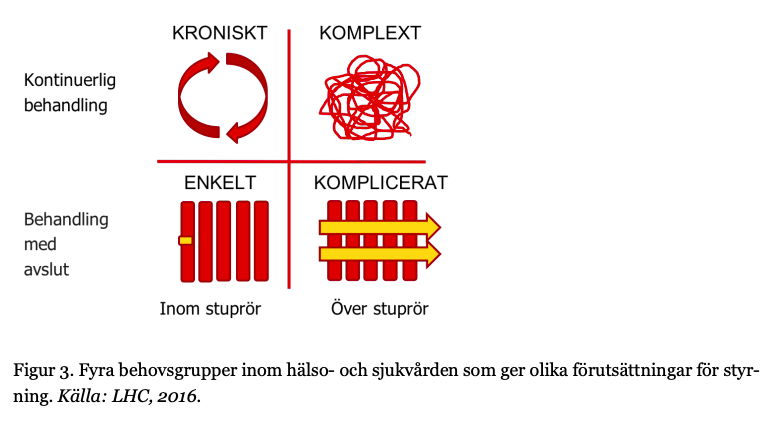Ett annat exempel på tillämpad systemteori inom hälso- och sjukvården är LHC:s fyrfältare, som definierar olika patientgrupper utifrån tidsperspektivet i de insatser dessa är i behov av, samt antalet enskilda vårdgivare som behöver involveras för att tillgodose behoven. Matrisen illustrerar hur olika kombinationer av dessa parametrar resulterar i organisatoriskt enkla, komplicerade, långvariga respektive komplexa vårdbehov.